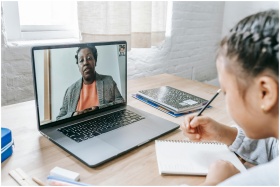 Back view of crop anonymous focused ethnic girl having exam with tutor through internet on netbook