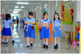 Group of schoolchildren in uniforms walking through a brightly lit hallway.