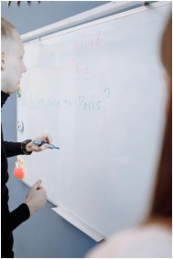 Teacher explaining English lesson using a whiteboa