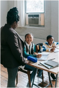 Teacher interacting with attentive students in a lively classroom setting.
