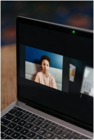 A young African American girl participates in an online class at home on a laptop.