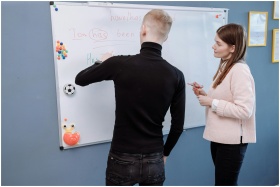 A student and teacher engage in an English lesson on a whiteboard. Indoor educational setting.