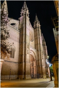 Stunning night view of the illuminated Mallorca Cathedral with gothic architecture.