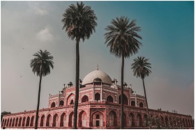 A captivating view of Humayun's Tomb surrounded by palm trees against a clear sky in New Delhi, India.