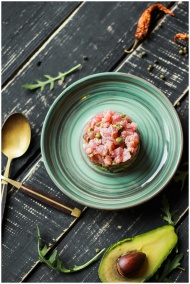 Fresh salmon tartare with avocado on elegant plate
