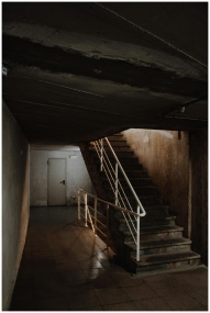 Explore a dimly lit abandoned stairwell with a spooky atmosphere.
