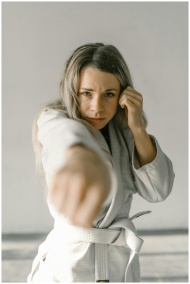 Focused woman in martial arts pose wearing a white