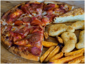 A close-up shot of pizza, Spanish omelette, sweet potato fries, and nuggets on a wooden table.