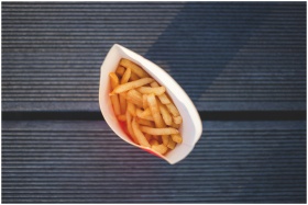 Close-up of golden french fries in a white paper c