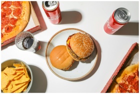 An appetizing fast food spread featuring pizza, burgers, and cola cans on a white tabletop.