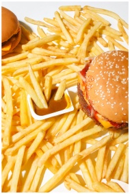 A delicious burger and fries on a white background