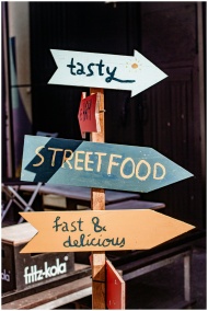 Vibrant street food sign in Riga, pointing to tasty and delicious options.