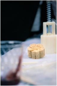 Detailed view of mooncake crafting with a mold, showcasing traditional Chinese culinary art.