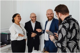 A diverse group of business professionals smiling and discussing ideas in an office setting.