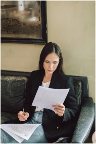 Businesswoman in black blazer analyzing paperwork while sitting on a couch.