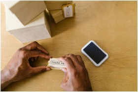 Hands of a small business owner sealing thank you cards with an ink pad.