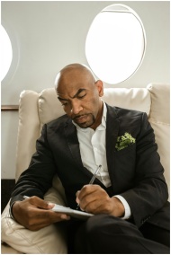 Focused businessman in a suit writing on a private jet. Professional travel setting.