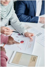 Diverse team members collaboratively reviewing business charts and documents during a meeting indoors.