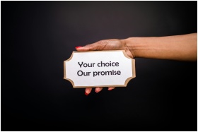 A hand holds a sign saying 'Your choice, Our promise' against a dark background.
