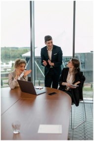 Team of professionals collaborating in an office setting, showcasing a successful meeting.