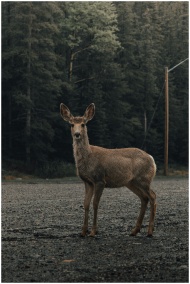 A deer stands on a dirt road against a misty forest backdrop, Alberta, Canada.