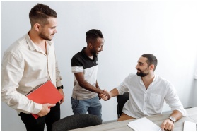 Three men in an office setting, shaking hands, representing teamwork and diversity.