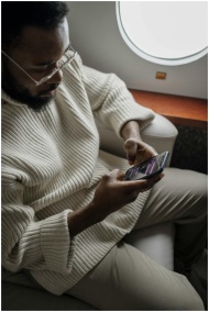 Professional man using smartphone during a flight, seated near a window.