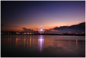 Capture the beauty of an illuminated ferris wheel reflecting over the water during a vibrant sunset.