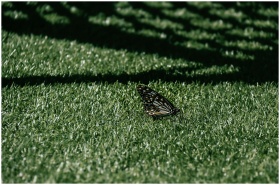 A butterfly with intricate patterns rests on vibrant green grass under dappled sunlight.