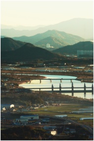 Beautiful view of mountains, river, and bridge in a tranquil setting at day.