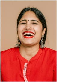 A cheerful South Asian woman laughing with red lips and traditional earrings, set against a beige background.