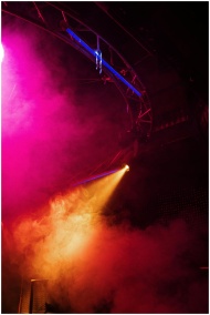Colorful nightclub scene with vibrant lighting and smoke creating an energetic party vibe.