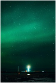 Beacon with glowing rays under colorful green sky with northern lights at dusk