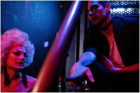 Intimate nightclub encounter showcasing a glamorous drag queen with red and blue lighting.