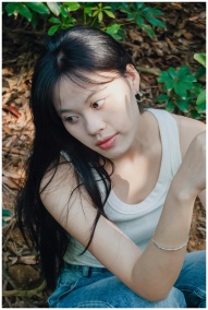 A thoughtful woman with long hair sits among lush greenery outdoors.
