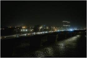 A night scene featuring a bridge with bustling traffic and illuminated cityscape in the background.