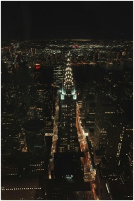 Dramatic aerial shot of illuminated Chrysler Build