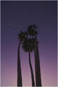 From below dark tall palms against sunset sky in pink and purple colors