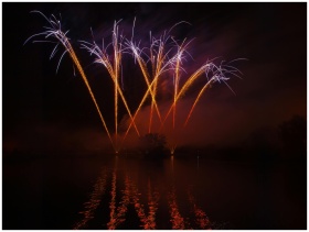 A vibrant fireworks display illuminating the night sky and lake in Essex, England.