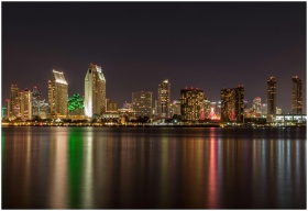 Captivating view of San Diego's skyline illuminated at night, reflecting in the calm waters.