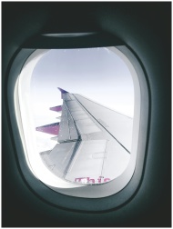 View of an airplane wing through a window, capturi