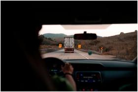 Scenic drive with a truck on a highway surrounded by hills. Perfect for travel themes.
