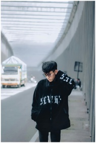 Casual portrait of a young man in modern street style coat in a city tunnel.