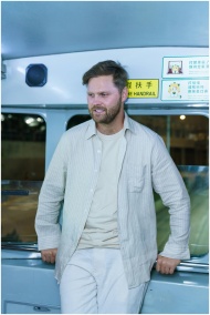 Man standing in a bus with signs in Chinese, looking away thoughtfully.