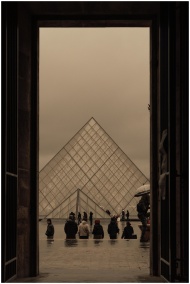 Framed view of the Louvre Pyramid in Paris on a rainy day, capturing modern and historic architectural contrast.