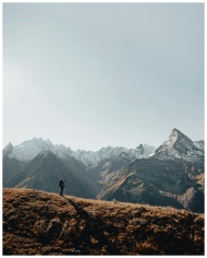 Hiker explores the dramatic, scenic mountains of the Caucasus under a clear sky, capturing adventure and wanderlust.