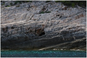 A rugged rocky cliff beside a calm azure sea, capt