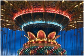 Vibrant lights illuminate a carousel at twilight in a bustling theme park.