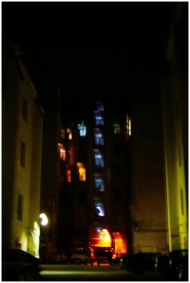 A dark and moody urban alleyway with dimly lit buildings and blurred lights at night.