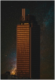 A high-rise building stands illuminated against a starry night sky in Nantes, France.